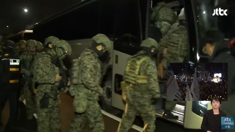 헬기를 타고 온 계엄군이 국회 진입을 시도하고 있을 때, 제1공수특전여단 소속 200여 명은 군용차량을 타고 국회 앞에 도착했습니다.