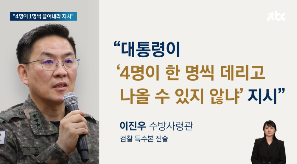 이진우 수방사령관은 최근 검찰에 "내란 당시 윤 대통령이 전화 와 '4명이 들어가서 한 명 씩 데리고 나올 수 있지 않으냐'고 말했다"고 진술했습니다.