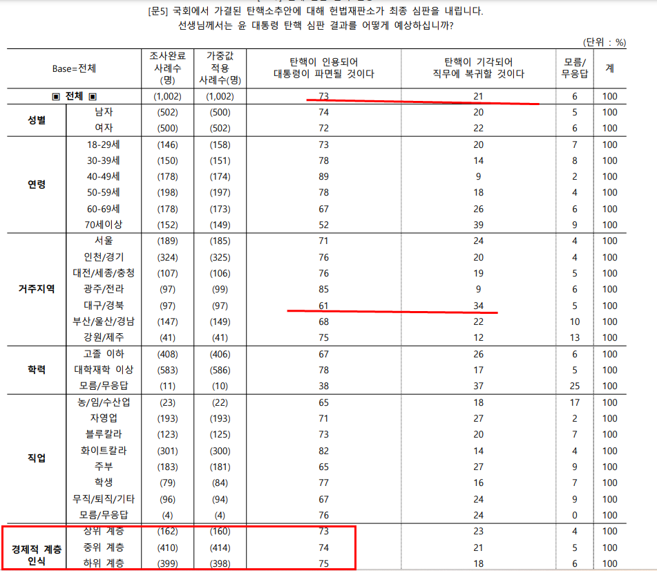 윤석열이 헌법재판소에서 파면될 것이다 73%, 탄핵 기각 21%