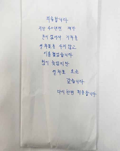 여성은 “죄송합니다. 40년 전 제가 돈이 없어서 열차표를 사지 않고 기차를 이용했습니다. 많이 늦었지만 열차표 요금 갚습니다. 다시 한 번 죄송합니다”라는 글을 남겼다.