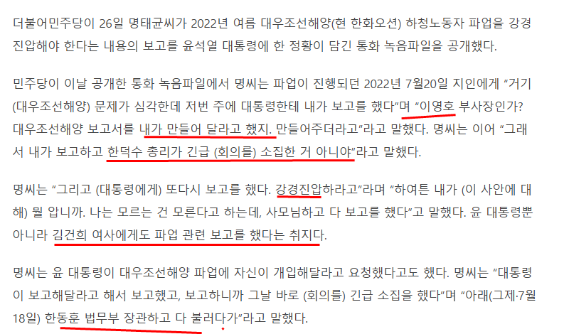 민주당이 이날 공개한 통화 녹음파일에서 명씨는 파업이 진행되던 2022년 7월20일 지인에게 “거기(대우조선해양) 문제가 심각한데 저번 주에 대통령한테 내가 보고를 했다”며 “이영호 부사장인가? 대우조선해양 보고서를 내가 만들어 달라고 했지. 만들어주더라고”라고 말했다. 명씨는 이어 “그래서 내가 보고하고 한덕수 총리가 긴급 (회의를) 소집한 거 아니야”라고 말했다.