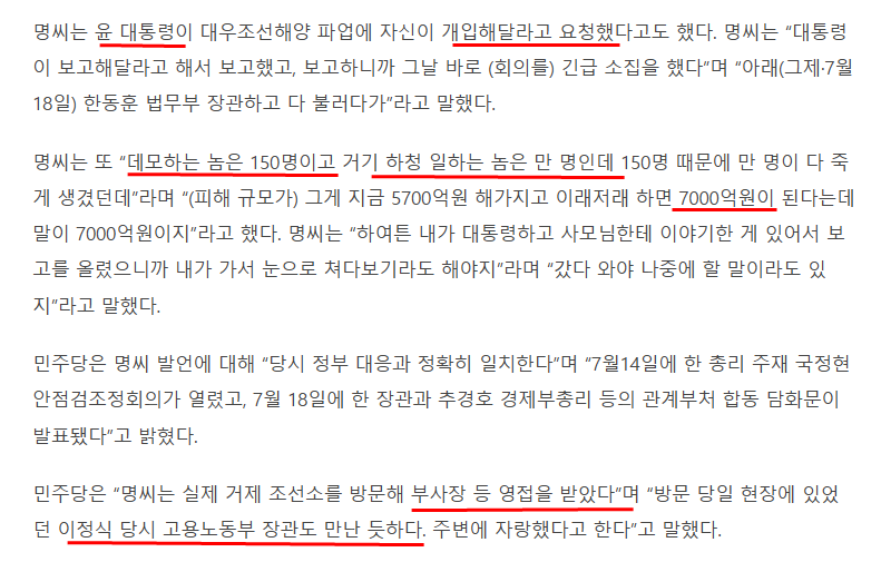 명씨는 윤 대통령이 대우조선해양 파업에 자신이 개입해달라고 요청했다고도 했다. 명씨는 “대통령이 보고해달라고 해서 보고했고, 보고하니까 그날 바로 (회의를) 긴급 소집을 했다”며 “아래(그제·7월18일) 한동훈 법무부 장관하고 다 불러다가”라고 말했다.