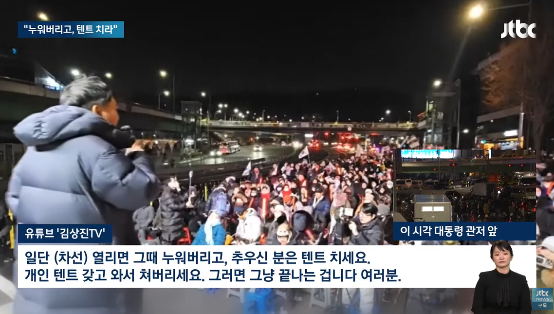 [유튜브 '김상진TV' : 일단 (차선) 열리면 그때 누워버리고, 추우신 분은 텐트 치세요. 개인 텐트 갖고 와셔 쳐버리세요. 그러면 그냥 끝나는 겁니다 여러분.]