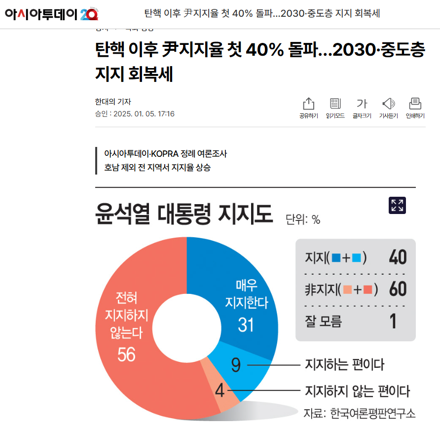 아시아투데이 사설. 계엄 이후, 윤석열 지지율이 40%를 돌파했다고 적어놨다. 탄핵결과와 계엄에 대한 설문문항은 하나도 없이 왜곡하기 좋게 만든 설문기법이다.