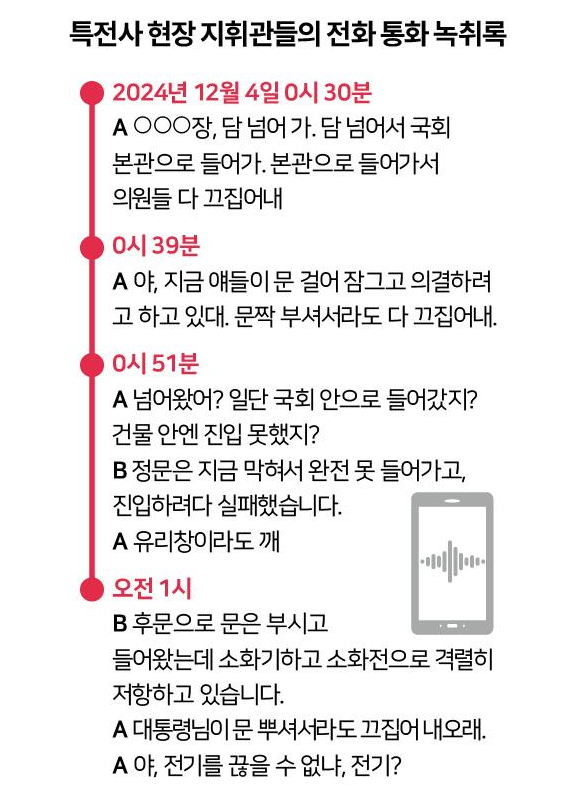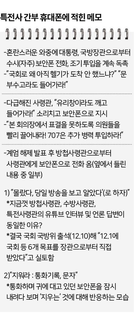 특수본은 계엄 당일 곽 전 사령관 지시를 받고 국회 등을 침입한 특전사 지휘관들의 전화 통화 녹취록과 특전사 간부가 휴대폰에 적은 메모도 확보했다. 녹취록에는 곽 전 사령관이 김용현 전 장관의 전화를 받은 뒤 다급하게 소리치며 국회 투입 등을 지시하는 내용이 고스란히 담겼다. 메모에는 여인형 전 방첩사령관이 곽 전 사령관에게 전화해 '(계엄 선포를) 몰랐다. 당일 방송을 보고 알았다(로 하자)', '문자를 지우라' 등을 요구한 내용이 적혀 있었다.