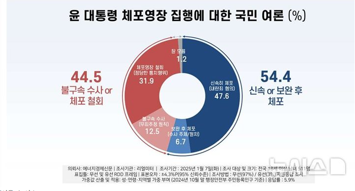 여론조사 전문업체 리얼미터가 에너지경제 의뢰로 지난 7일 전국 18세 이상 유권자 511명을 대상으로 실시한 여론조사에서 '윤석열 대통령 체포영장 집행' 관련 문항에 응답자 54.4%는 신속 또는 보완 후 집행해야 한다고 답했다. 불구속 수사나 체포를 철회해야 한다는 응답은 44.5%였다.