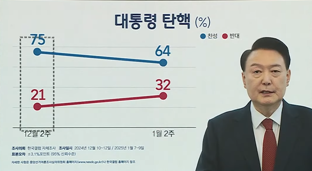 윤석열 내란, 국회폭동. 여론조사. 탄핵 찬성 75%에서 64%로 낮아진 이유.