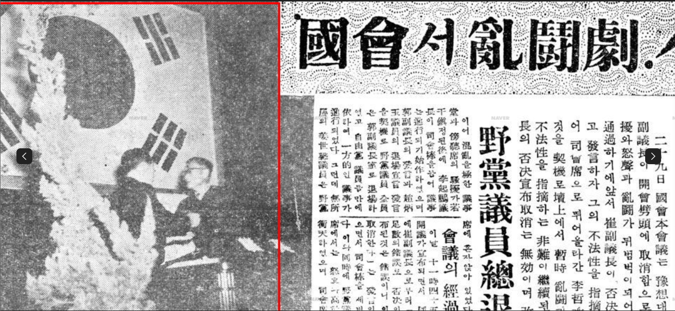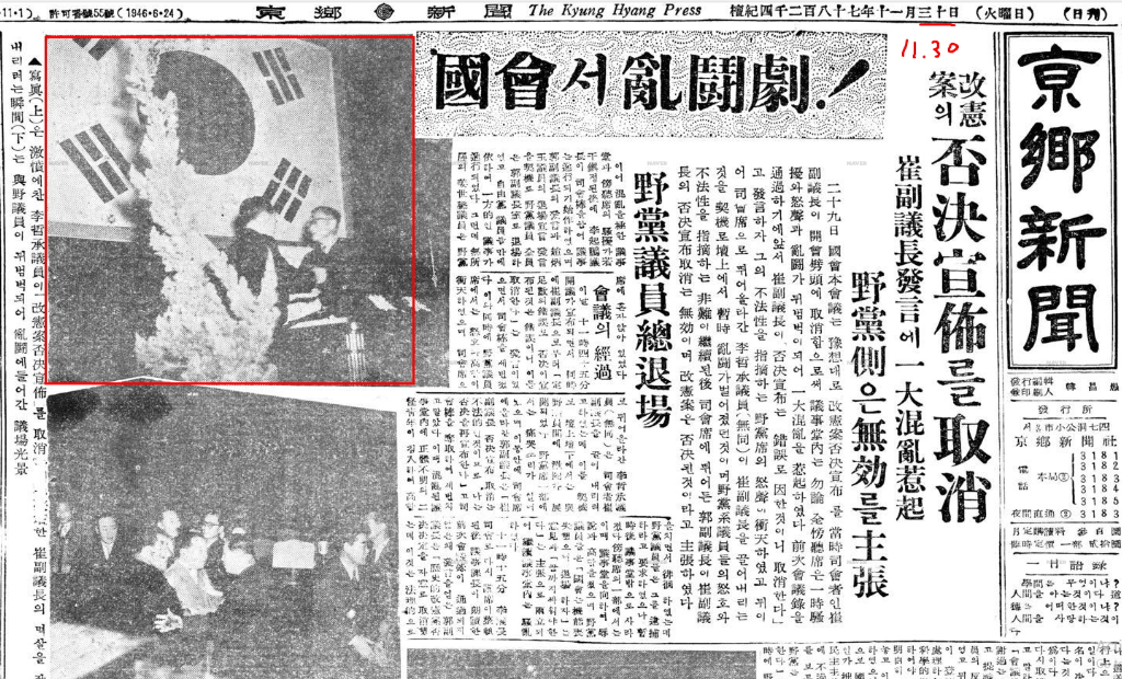11월 30일자 경향신문 1면에는, 이철승 의원이 국회의장 최순와 몸싸움을 벌이고 있다. “국회서 난투극” 제목이다.