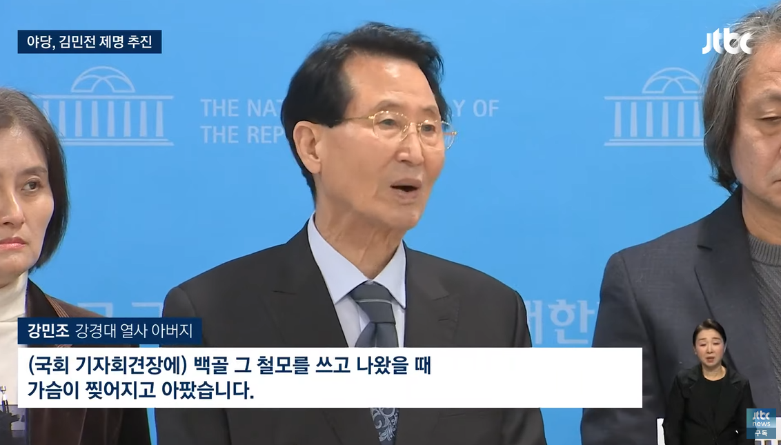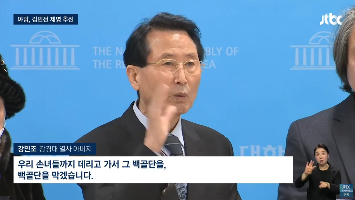 강경대 군 아버지 강민조씨가 김민전의 '백골단' 국회초청을 비판하고 있다.