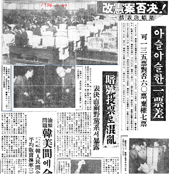 ‘개헌’ 안 표결 결과는 기가 막히게도 135표 찬성이었다. (반대 60표, 기권 7표) 11월 27일 국회는 ‘원 포인트 개헌’ 부결을 선포했다. 그런데 11월 29일 자유당(이승만,이기붕)이 국회를 다시 소집하고, 최순주 부의장이 정족수 계산이 잘못되었다고 우겼다.