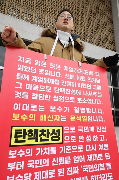 대통령 탄핵안 2차 표결을 하루 앞둔 지난달 13일 국회 본청 앞에서 동료 의원들에게 탄핵에 찬성해줄 것을 호소하는 김상욱 의원. 연합뉴스