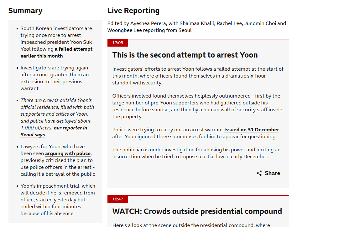 Here's a look at the scene outside the presidential compound, where protesters have gathered as investigators are trying once more to arrest impeached president Yoon Suk Yeol: