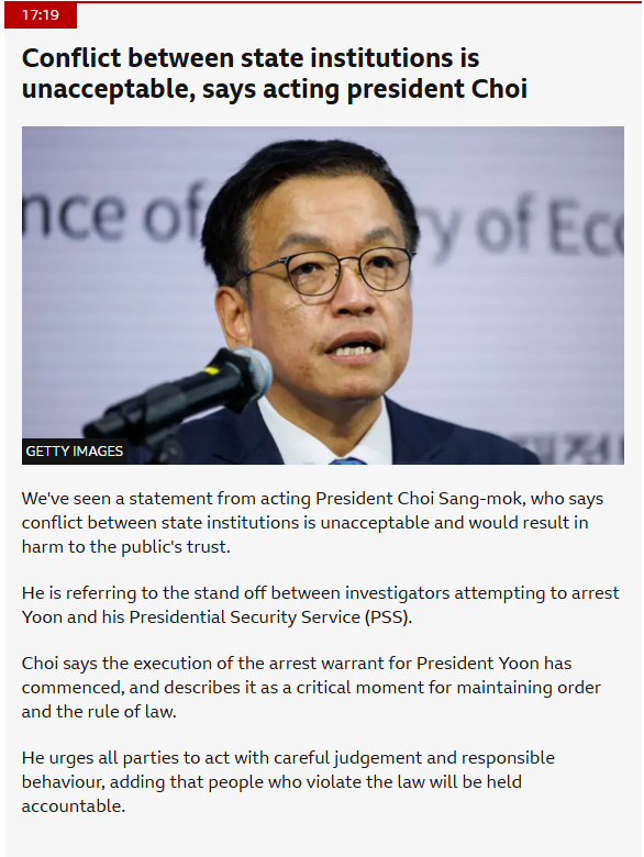 최상목이 할 일은 앵무새처럼 '무력충돌 하지 마쇼'라고 외칠 것이 아니라, 법원이 체포영장을 발부했으면, 경호초는 윤석열 체포에 협조하라고 발표하는 것이다. 3권 분립의 원칙이라도 지키는 게 행정부 역할 아닌가? 최상목과 경제관료들이 지금 국내외적으로 할 수 있는 것은 거의 없다.