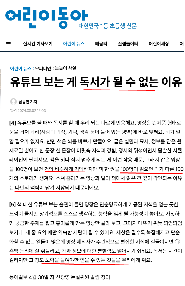 유튜브 보는 게 독서가 될 수 없는 이유 - 어린이동아