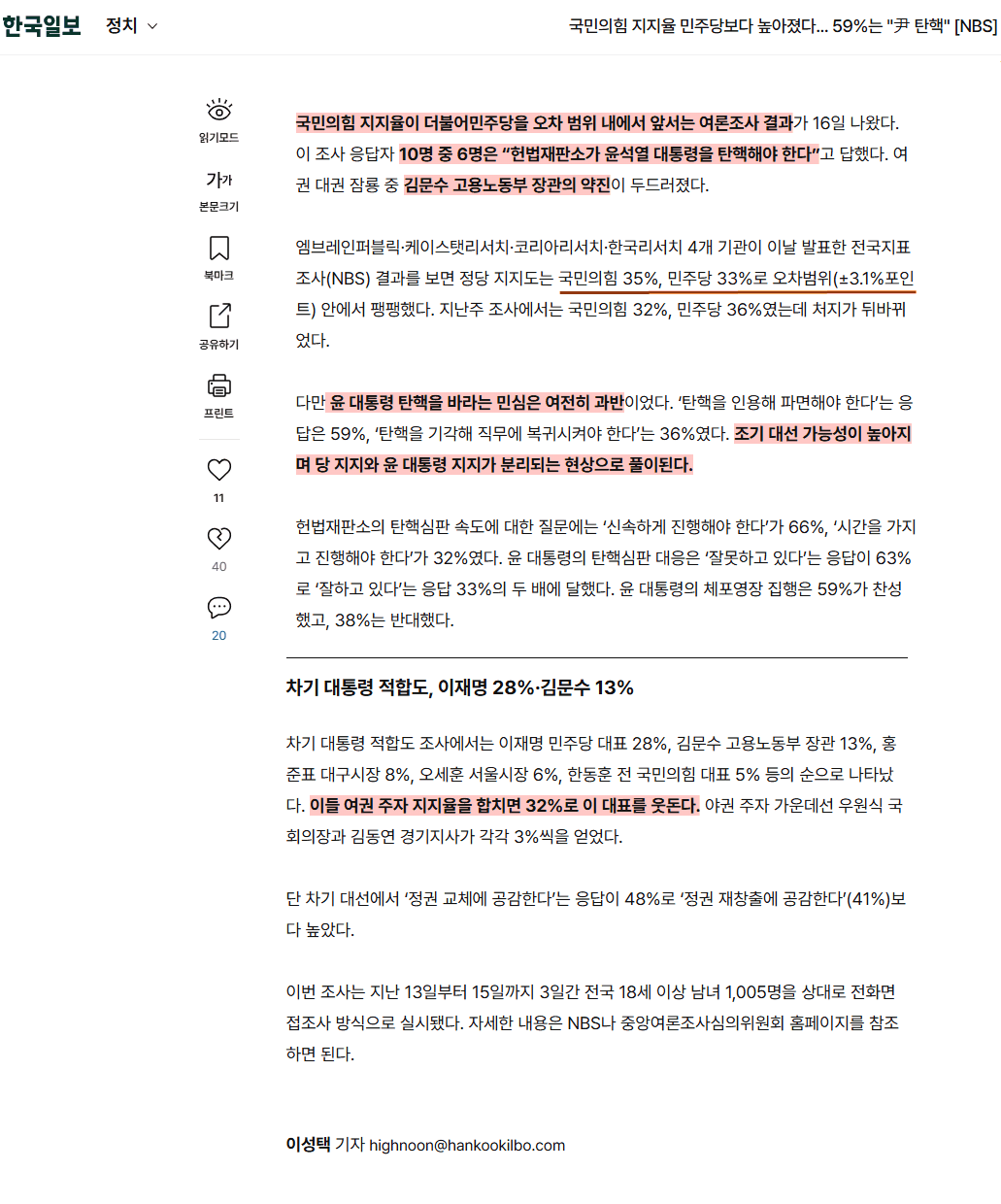 국민의힘 지지율이 더불어민주당을 오차 범위 내에서 앞서는 여론조사 결과가 16일 나왔다. 이 조사 응답자 10명 중 6명은 “헌법재판소가 윤석열 대통령을 탄핵해야 한다”고 답했다. 여권 대권 잠룡 중 김문수 고용노동부 장관의 약진이 두드러졌다.
