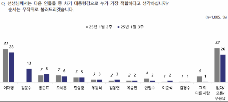차기 대통령 적합도 조사에서는 이재명 민주당 대표 28%, 김문수 고용노동부 장관 13%, 홍준표 대구시장 8%, 오세훈 서울시장 6%, 한동훈 전 국민의힘 대표 5% 등의 순으로 나타났다. 이들 여권 주자 지지율을 합치면 32%로 이 대표를 웃돈다. 야권 주자 가운데선 우원식 국회의장과 김동연 경기지사가 각각 3%씩을 얻었다.