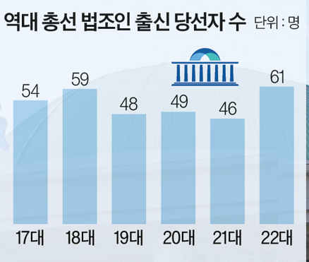 국회의원 중 변호사 수는 15대와 16대에 각 41명, 17대 54명, 18대 58명, 19대 42명, 20대 49명, 21대 46명, 22대 현재 61명으로 이제 20%를 넘어섰다.