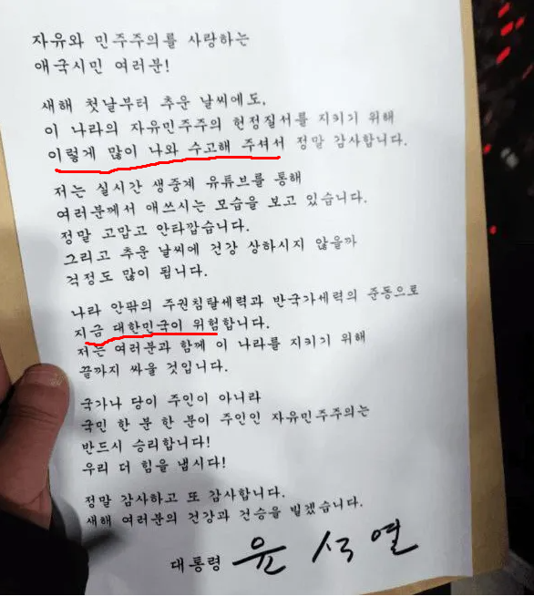 이들을 ‘폭도’로 만든 데는 윤 대통령과 여당 책임이 적지 않다. 윤 대통령은 계엄 이후 사법시스템을 부정하며 줄곧 지지자 선동 메시지를 쏟아냈다. 체포 위기에 몰리자 “여러분과 함께 끝까지 싸울 것”이라는 입장문을 냈고, 체포 뒤에는 “(계엄 선포로) 많은 국민과 청년들이 주권자로서 권리와 책임 의식을 가지게 됐다”는 자필 원고를 공개했다.