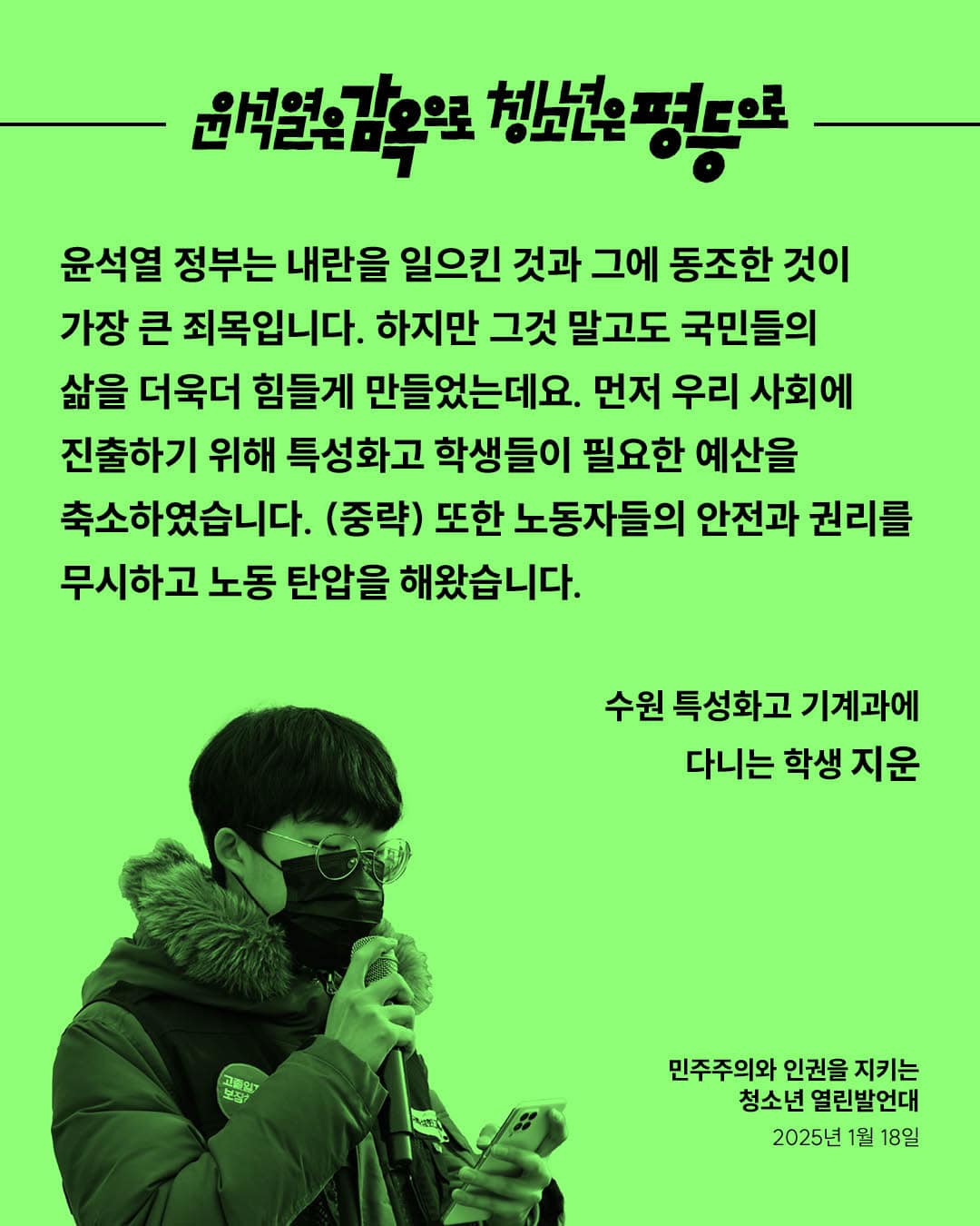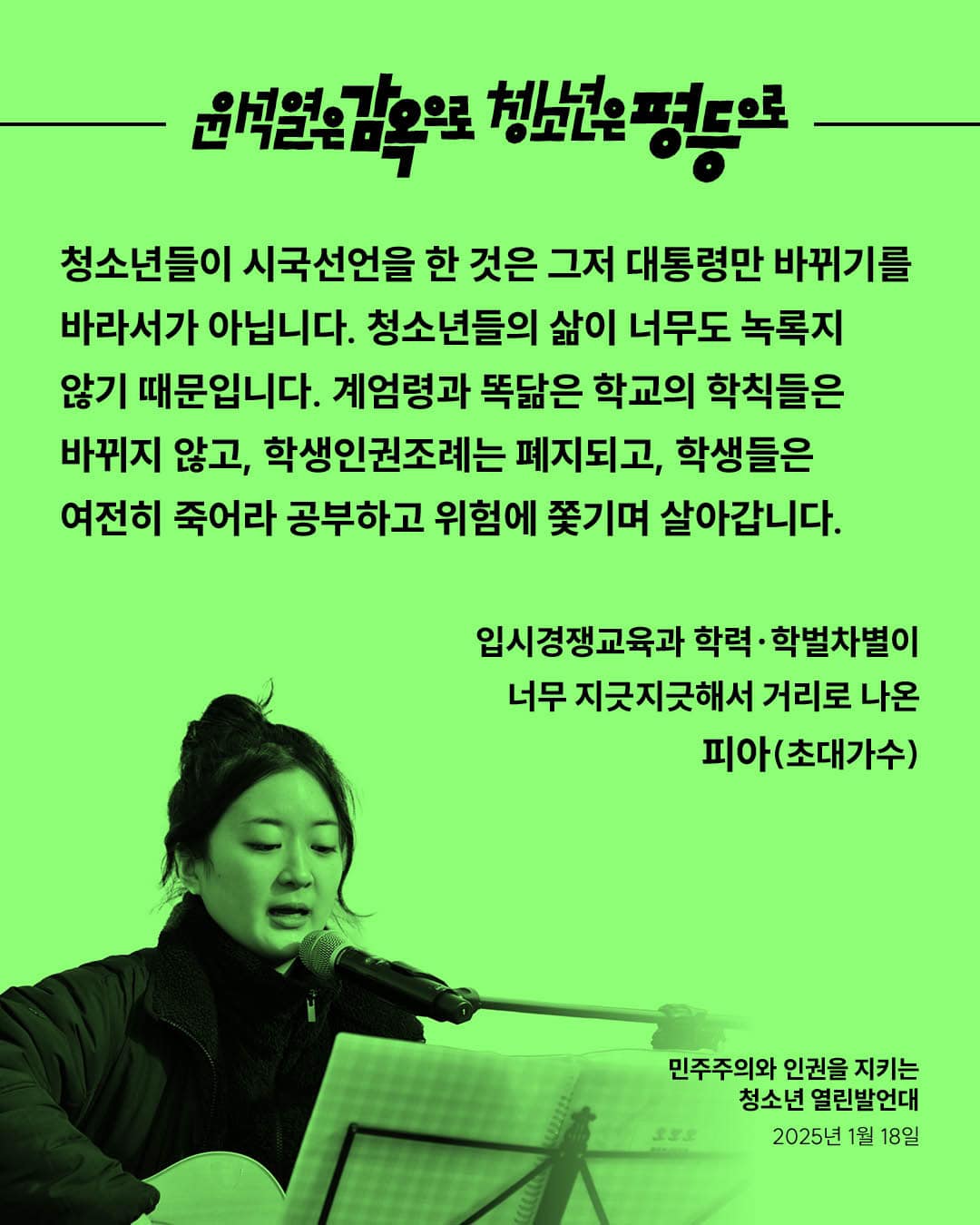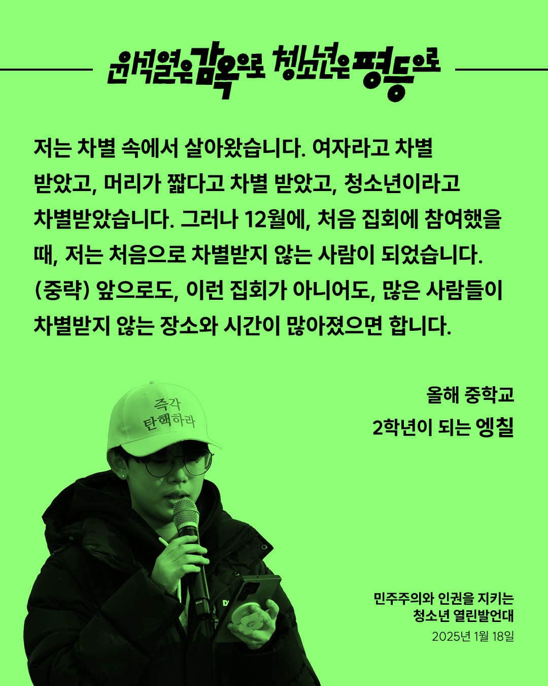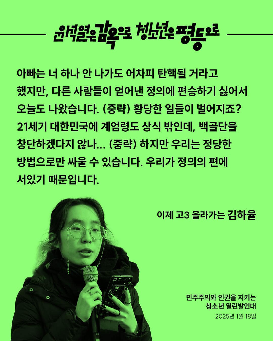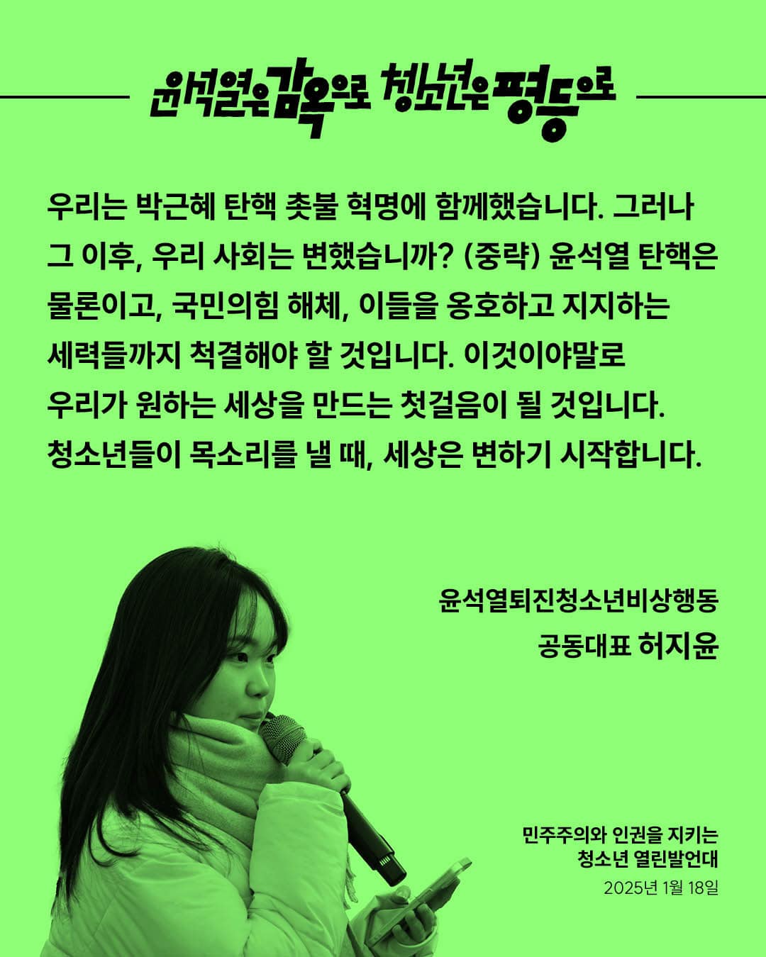 우리는 박근혜 탄핵 촛불 혁명에 함께했습니다. 그러나 그 이후, 우리 사회는 변했습니까? (중략) 윤석열 탄핵은 물론이고, 국민의힘 해체, 이들을 옹호하고 지지하는 세력들까지 척결해야 할 것입니다. 이것이야말로 우리가 원하는 세상을 만드는 첫걸음이 될 것입니다. 청소년들이 목소리를 낼 때, 세상은 변하기 시작합니다.