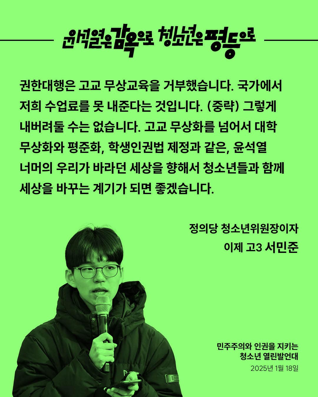 권한대행은 고교 무상교육을 거부했습니다. 국가에서 저희 수업료를 못 내준다는 것입니다. (중략) 그렇게 내버려둘 수는 없습니다. 고교 무상화를 넘어서 대학 무상화와 평준화, 학생인권법 제정과 같은, 윤석열 너머의 우리가 바라던 세상을 향해서 청소년들과 함께 세상을 바꾸는 계기가 되면 좋겠습니다.