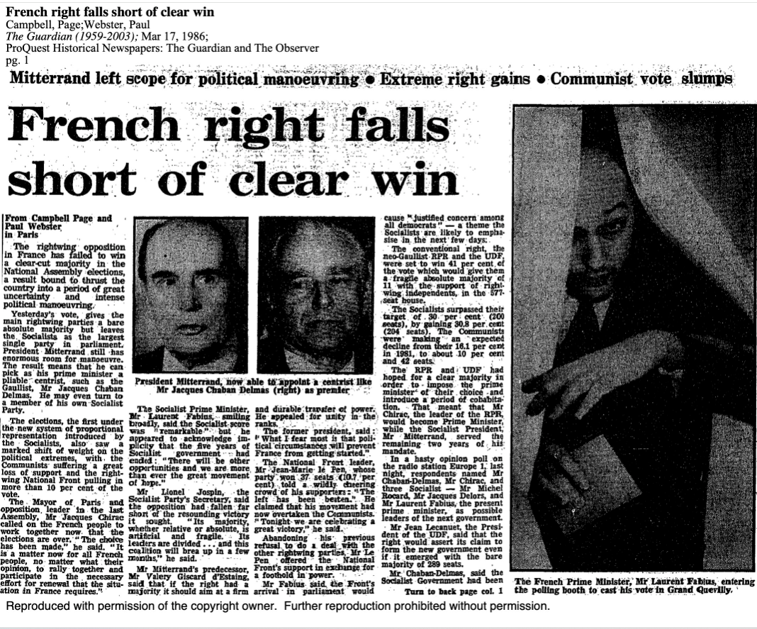 그러나 1986년 3월 총선에서는 중도우파연합이 다수당을 차지했다. 총 573석 중에, ‘프랑스민주연합’과 ‘공화국연합’이 연합해 만든 ‘‘혁신야당연합 UOR’이 277석, 사회당은 207석, 프랑스 공산당(PCF)은 35석, 르펜의 국민전선(FN)은 35석을 얻었다.