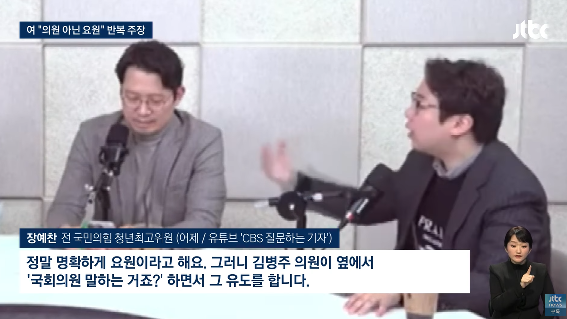 [장예찬/전 국민의힘 청년최고위원 (어제 / 유튜브 'CBS 질문하는 기자') : 정말 명확하게 요원이라고 해요. 그러니 김병주 의원이 옆에서 '국회의원 말하는 거죠?' 하면서 그 유도를 합니다.]