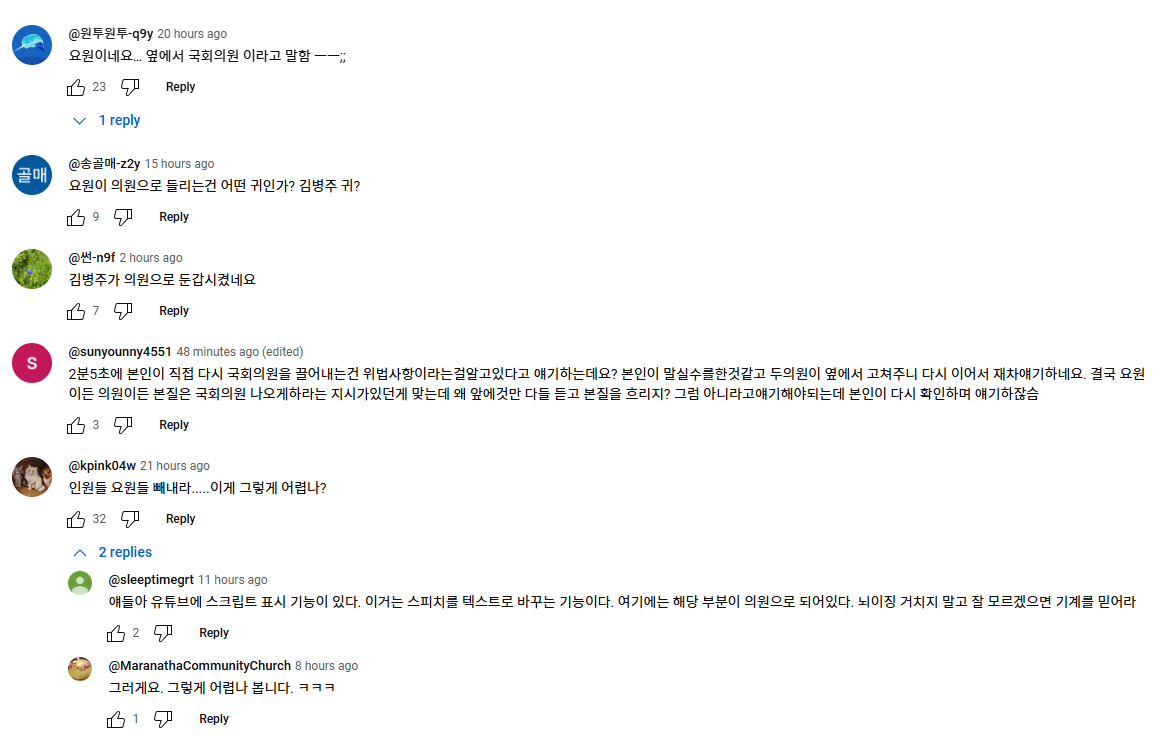 4. 오마이뉴스 유튜브에, 곽종근과 김병주 의원의 대화가 올라왔다. 이에 대해 윤석열 지지층들과 유튜버가 '요원'은 국회의원이 아니다라는 댓글을 달고 있다.