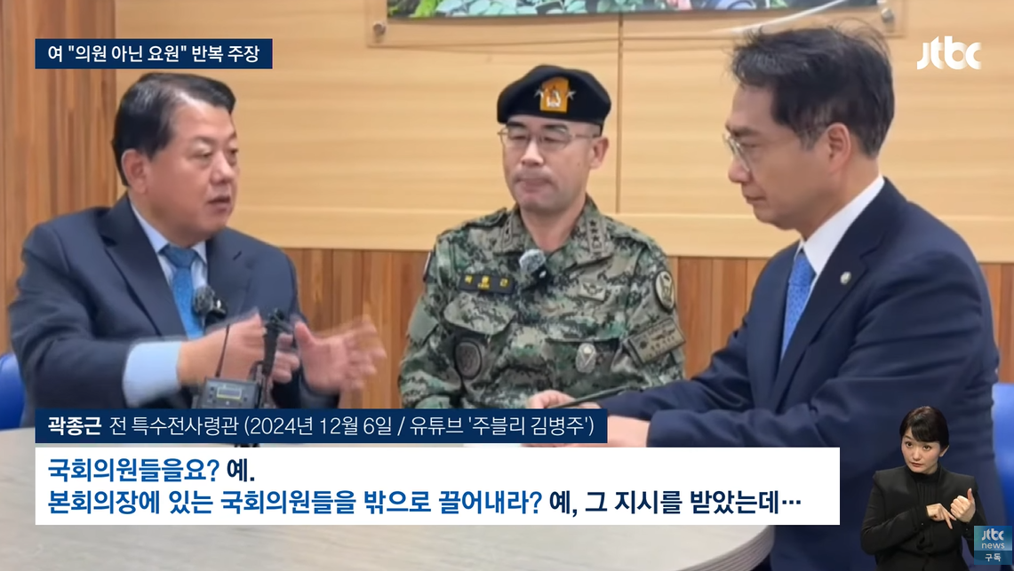 [곽종근/전 특수전사령관 (2024년 12월 6일 / 유튜브 '주블리 김병주') : 전임 장관으로부터 국회의사당 안에 있는 인원들을, 요원들을 밖으로 빼내라.