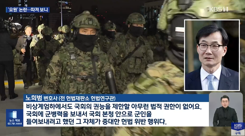 노희범/변호사 (전 헌법재판소 헌법연구관): "비상계엄하에서도 국회의 권능을 제한할 아무런 법적 권한이 없어요. 국회에 군 병력을 보내서 국회 본청 안으로 군인을 들여보내려고 했던 그 자체가 중대한 헌법 위반 행위다."