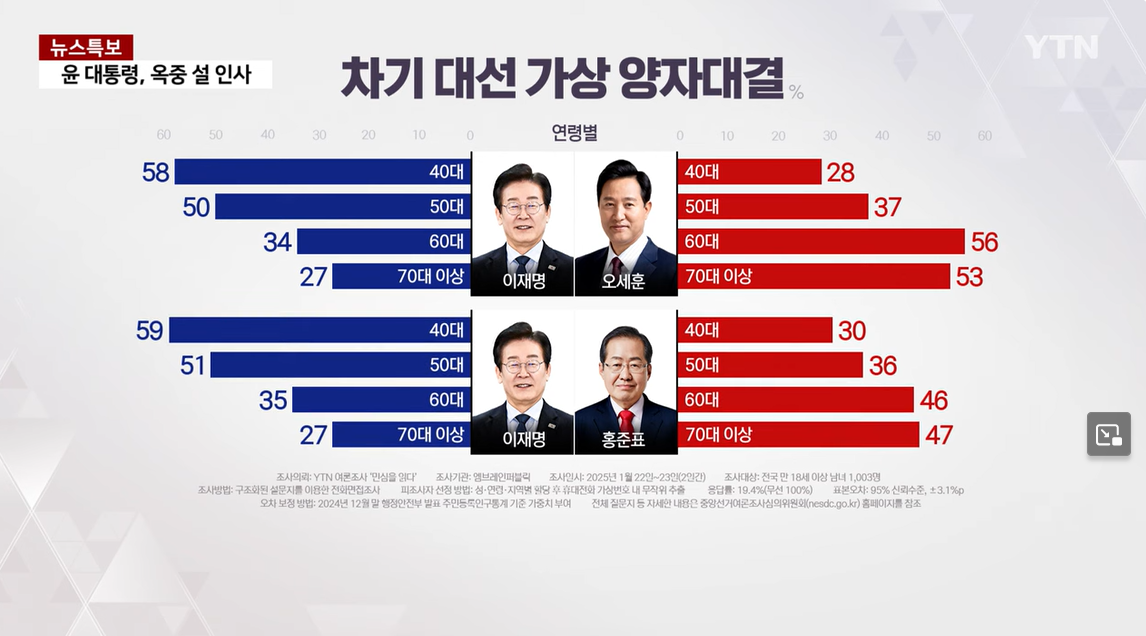 40대와 50대는 이재명, 60대와 70대 이상은 오세훈·홍준표 선호가 두드러졌습니다.