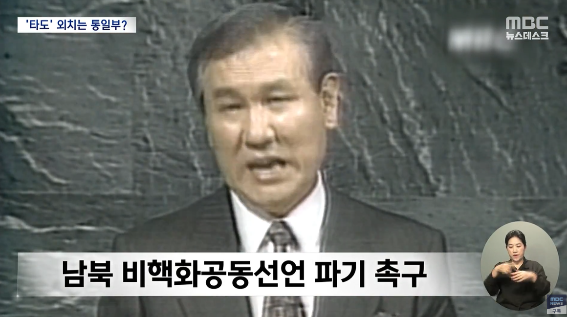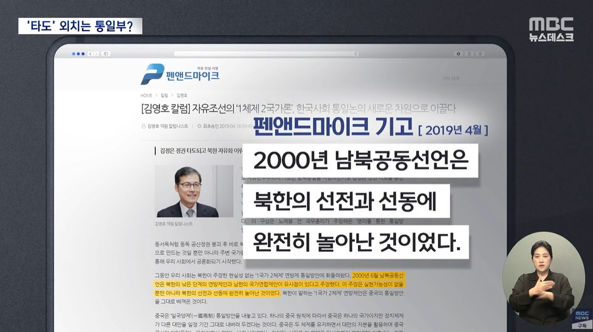 4년 전 기고문에는 "2000년 남북공동선언이 북한의 선전과 선동에 완전히 놀아난 것이었다"라고 적었고 또, 노태우 정권 시절의 남북 비핵화 공동 선언도 파기할 것을 윤 대통령에게 촉구하기도 했습니다.