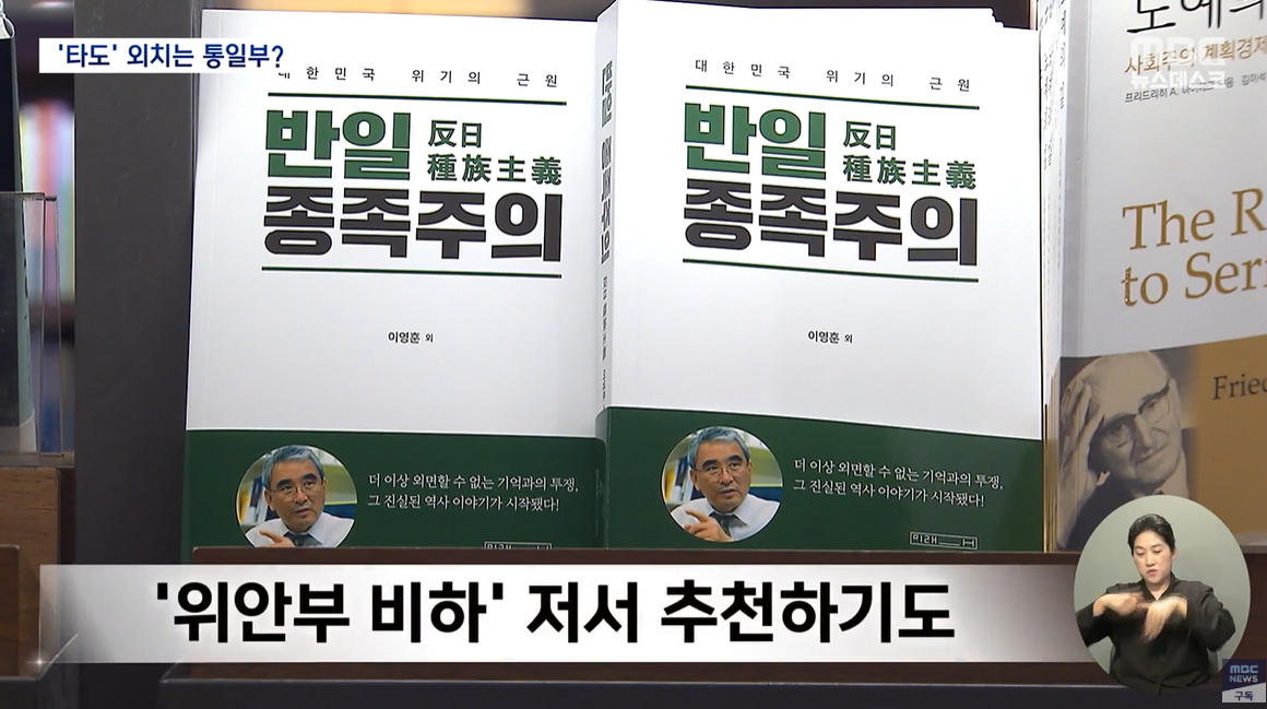 일본 위안부 피해자들을 자발적 매춘부로 묘사한 이영훈 교수의 저서 <반일종족주의>에 대해서는 감동적인 책이라고 치켜세우기까지 했습니다.