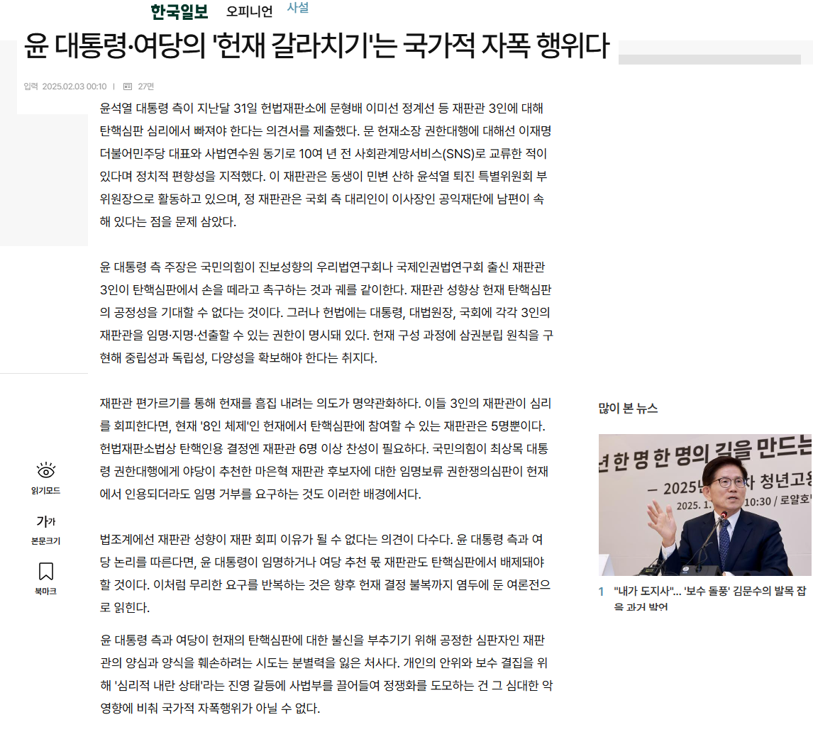 윤 대통령 측과 여당이 헌재의 탄핵심판에 대한 불신을 부추기기 위해 공정한 심판자인 재판관의 양심과 양식을 훼손하려는 시도는 분별력을 잃은 처사다. 개인의 안위와 보수 결집을 위해 '심리적 내란 상태'라는 진영 갈등에 사법부를 끌어들여 정쟁화를 도모하는 건 그 심대한 악영향에 비춰 국가적 자폭행위가 아닐 수 없다.