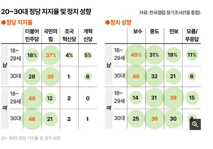 20~30대 정당 지지율 및 정치 성향