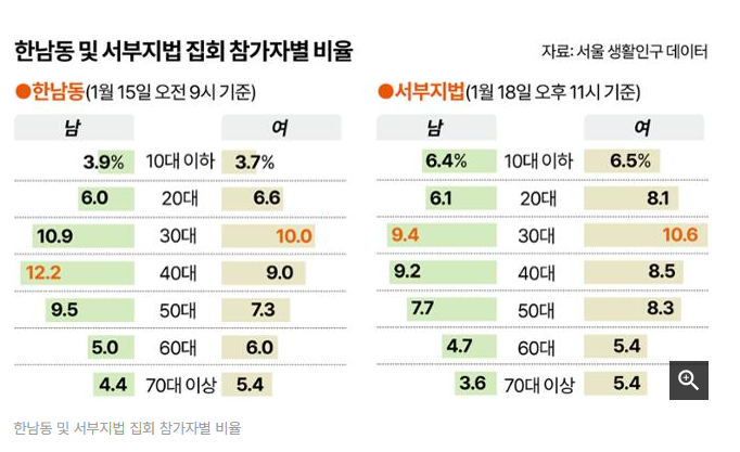 한남동 및 서부지법 집회 참가자별 비율