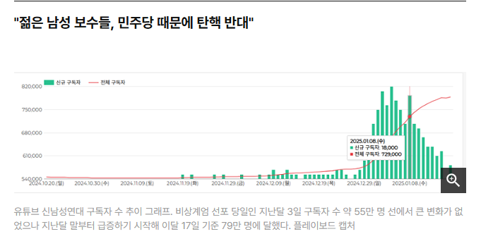 유튜브 신남성연대 구독자 수 추이 그래프. 비상계엄 선포 당일인 지난달 3일 구독자 수 약 55만 명 선에서 큰 변화가 없었으나 지난달 말부터 급증하기 시작해 이달 17일 기준 79만 명에 달했다. 플레이보드 캡처이미지 확대보기