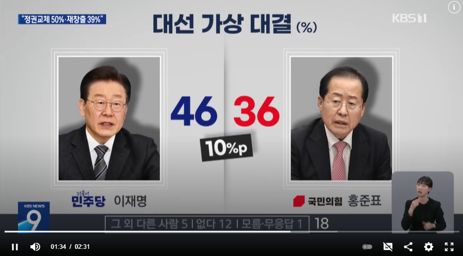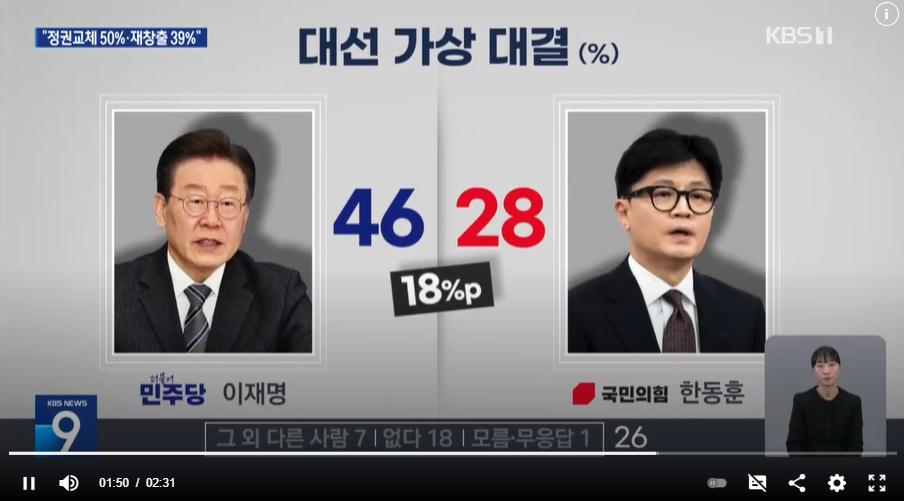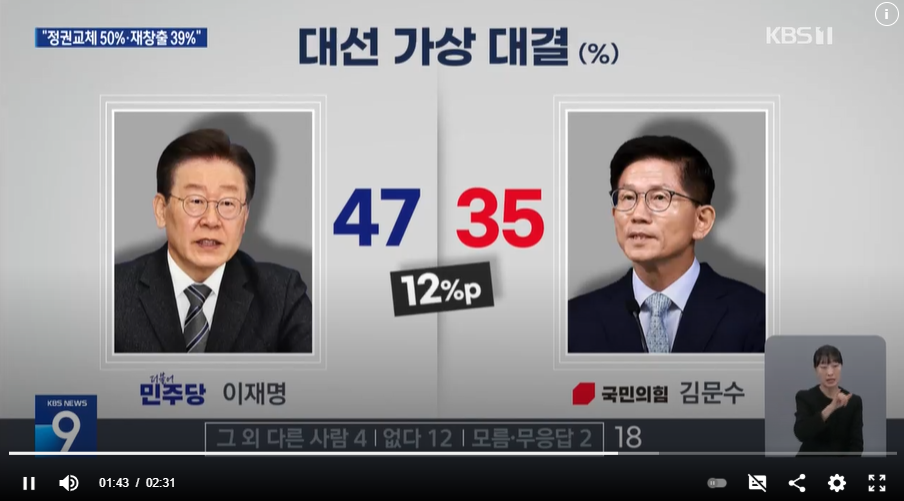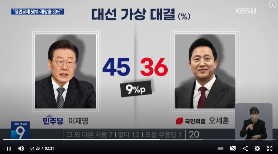 KBS 조사에서 이 대표와 오세훈 서울 시장은 45% 대 36%, 이 대표와 홍준표 대구 시장은 46% 대 36%, 이 대표와 김 장관은 47% 대 35%, 이 대표와 한동훈 전 국민의힘 대표는 46% 대 28%로 나타났다.