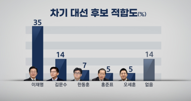 차기 대통령으로 누가 가장 적합한지 물었습니다. 응답자의 35%가 이재명 민주당 대표를 꼽았습니다. 이어서 김문수 고용노동부 장관이 14%, 한동훈 국민의힘 전 대표 7% 순으로 나타났습니다.