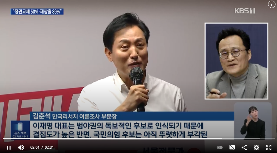 KBS가 한국리서치에 의뢰해 실시한 조사에서 정권교체를 바라는 민심은 50%로 정권 재창출(39%)보다 11%포인트 앞섰다.