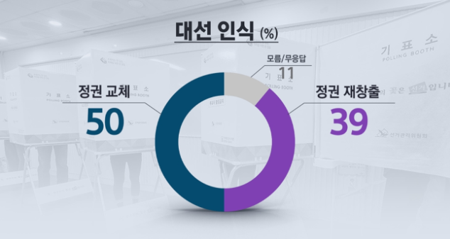 정권 교체를 위해 야당 후보에 힘을 실어줘야 한다는 응답이 50%로, 정권 재창출을 위해 여당 후보에 힘을 실어줘야 한다는 39% 응답보다 11%p 더 높았습니다.