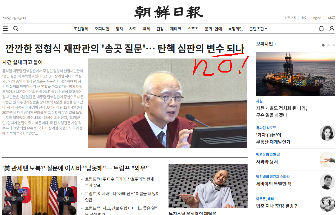조선일보가 마치 정형식 재판관이 윤석열 탄핵을 기각할 수도 있는 것처럼 제목을 달았다. 희망사항일 뿐이다.