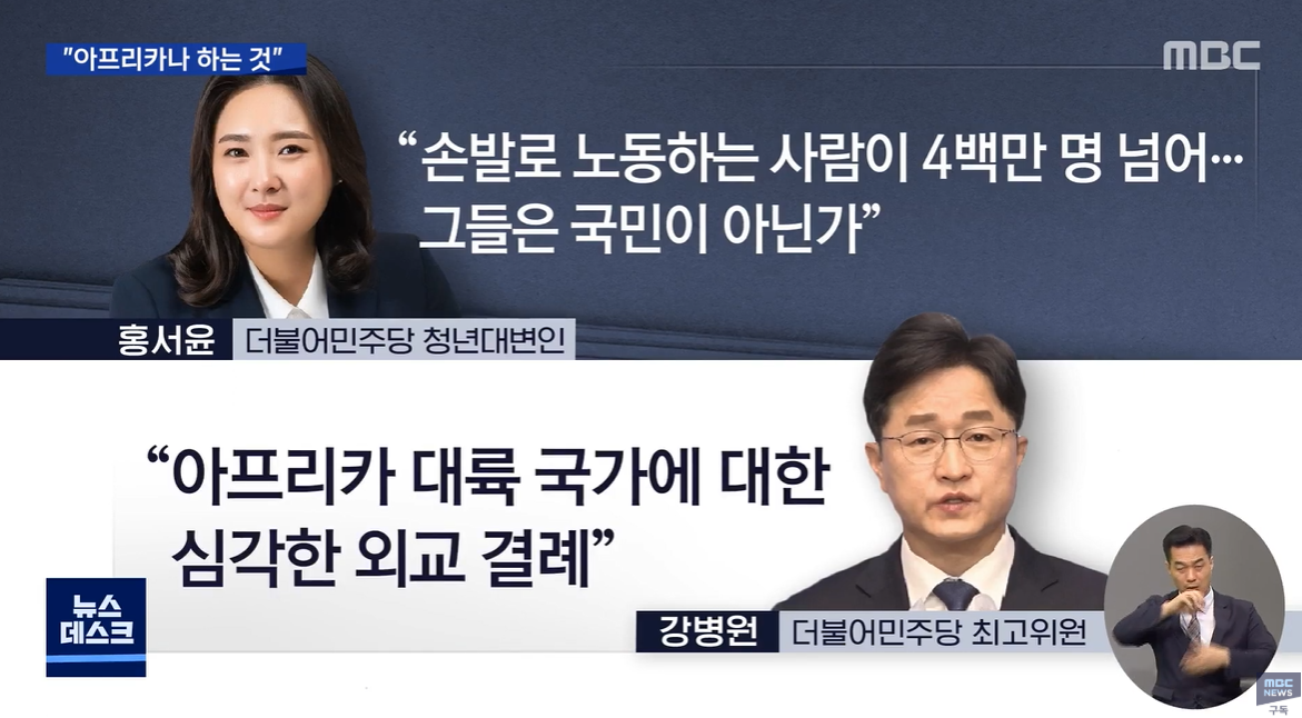 '손발노동은 아프리카나 하는 것'이란 발언을 두고도, 민주당에선 '손발로 노동하는 사람이 4백만 명이 넘는다. 이들은 국민이 아니냐'는 비판과 함께 아프리카 국가에 대한 심각한 외교결례라는 우려가 나왔습니다.