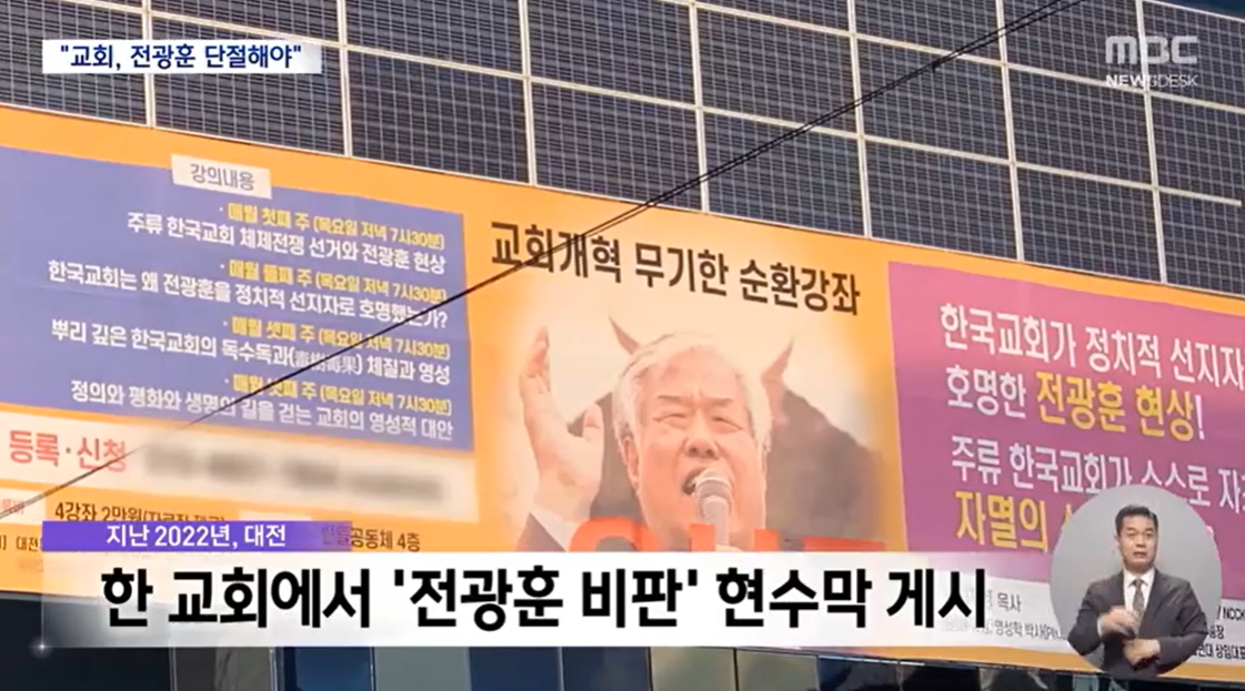 지난 2022년, 전 목사의 극우 정치 행보를 비판하는 강좌를 알리기 위해 대전 지역의 한 교회가 내건 현수막입니다.