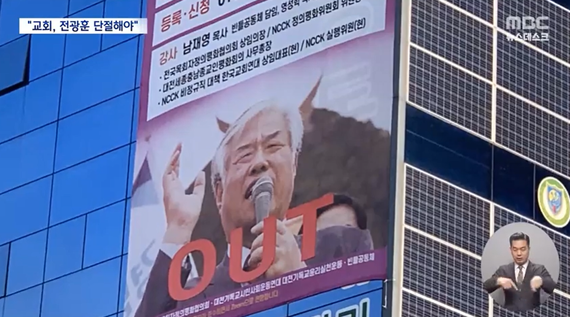뿔이 달린 전광훈 목사의 사진과 함께 아웃이라는 문구가 쓰인 현수막이 교회 건물에 걸렸습니다.