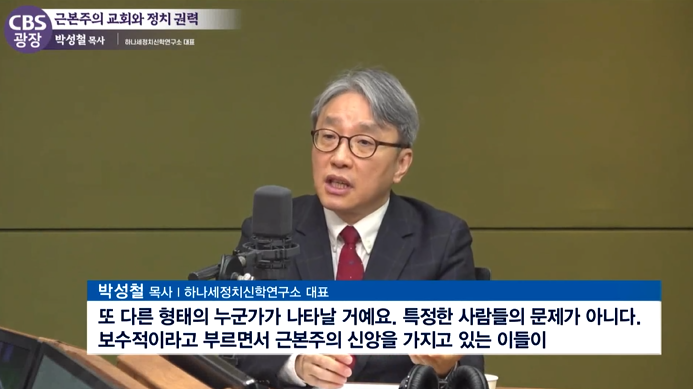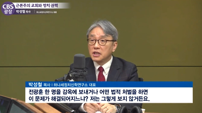 "전광훈 한 명을 감옥에 보내거나 어떤 법적 처벌을 하면 이 문제가 해결되어지느냐? 저는 그렇게 보지 않거든요. 또 다른 형태의 누군가가 나타날 거예요. 특정한 사람들의 문제가 아니다. 보수적이라고 부르면서 근본주의 생활을 가지고 있는 이들이 굉장히 많은 부분, 전광훈이라든가 특정한 태극기 부대만의 문제가 아니라 이들을 지원하는 한국교회의 다른 교단들, 교단 차원에서의 문제라든가, 대형교회의 문제라든가 이런 것들을 이제 짚어 나갈 수가 있는 것이죠."
