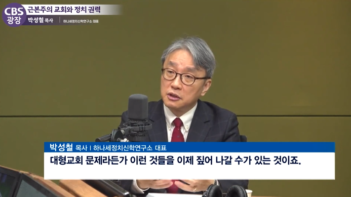 CBS 인터뷰에 나온 박성철, 안인섭, 배덕만 개신교 지도자들의 진단과 해법이 아직 좀 아쉬운 감이 있다. 개신교의 실질적인 문제들이 더 구체적으로 논의되었으면 한다.
