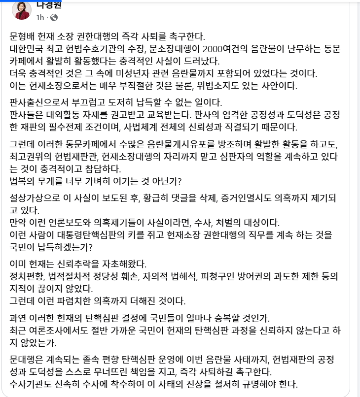 1. 나경원은 페이스북에서 문형배 헌법재판소 재판관이 음란물에 댓글을 달았다고 비난했다.