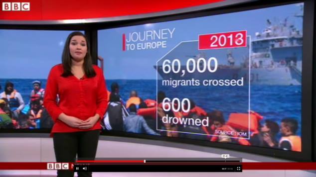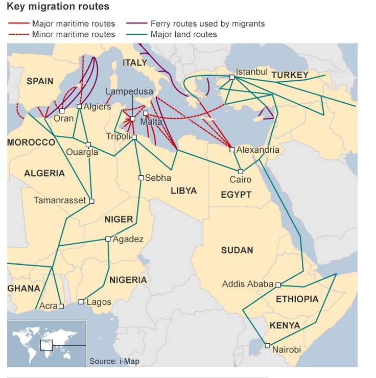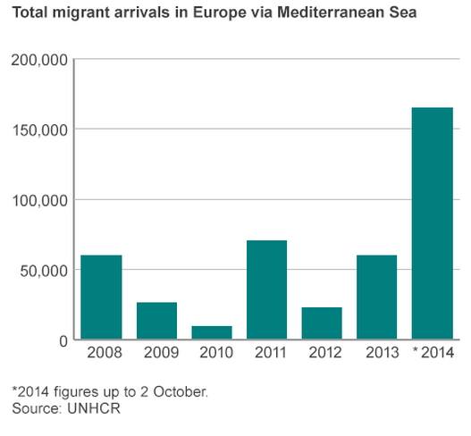 - 현황: 2014년에는 17만명이, 2013년에는 6만명이 배를 타고 지중해를 거쳐 유럽에 정착하려고 했다. 이 중 2014년에는 3500명이 2013년에는 600명이나 지중해에 익사했다고 한다.