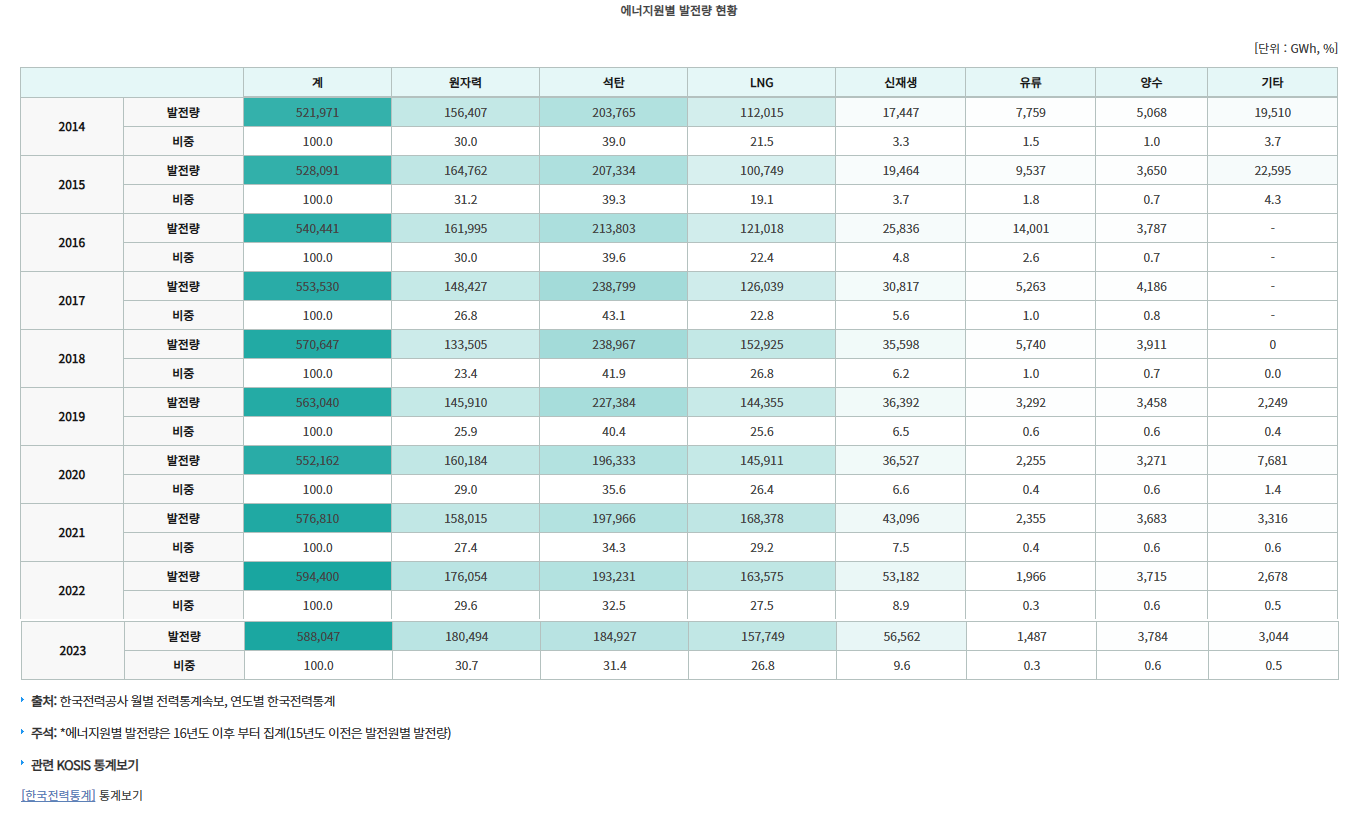에너지원별 발전량 현황 2023년 원자력 30.7, 석탄 31.4, LNG 26.8, 재생 9.6