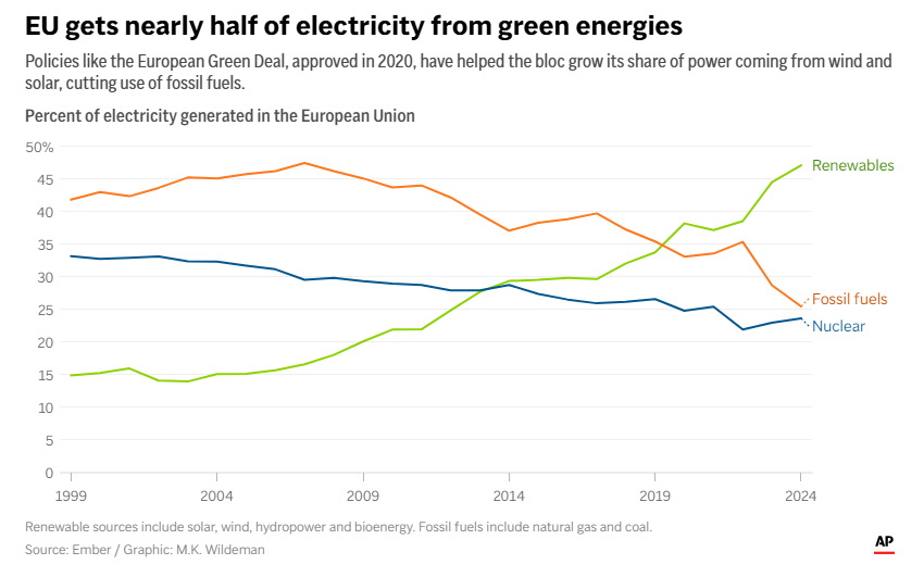 A record 47% of the European Union’s electricity now comes from solar and other renewables, a report Thursday said, in yet another sign of the growing gap between the bloc’s push for clean energy and the new U.S. administration’s pursuit of more fossil fuels.